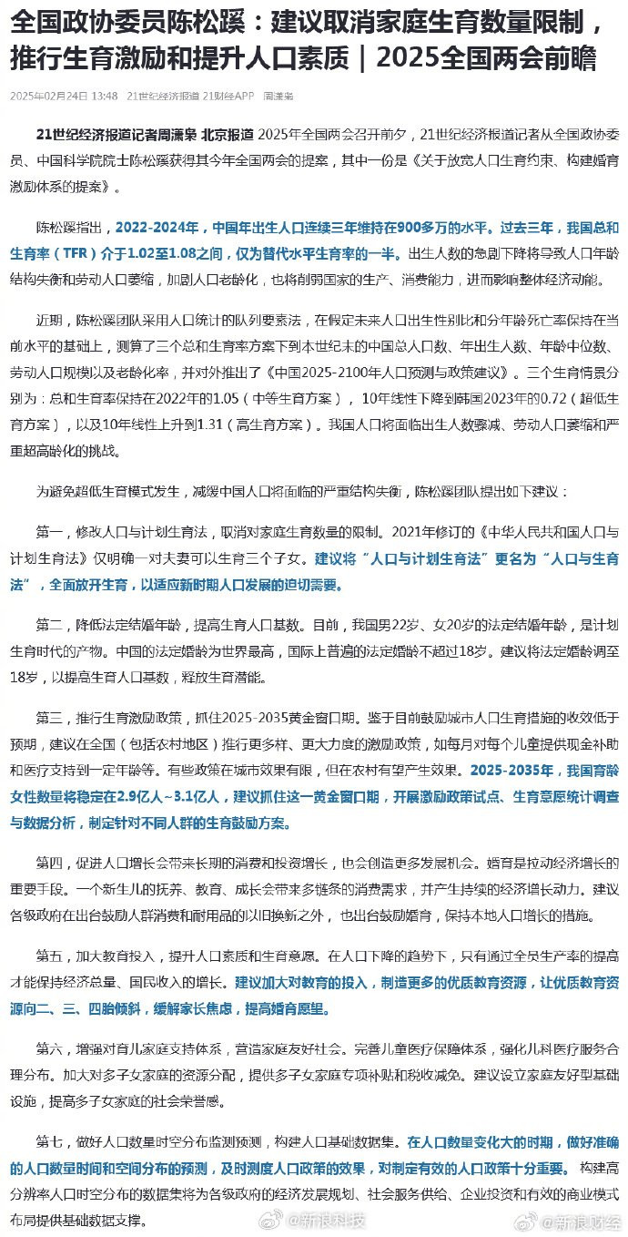 [#委员建议降低法定结婚年龄至18岁#]#聚焦2025年两会#2025年全国两会召开前夕,21世纪经济报道记者从全国政协委员、中国科学院院士陈松蹊获得其今年全国两会的提案,其中一份是《关于放宽人口生育约束、构建婚育激励体系的提案》。
